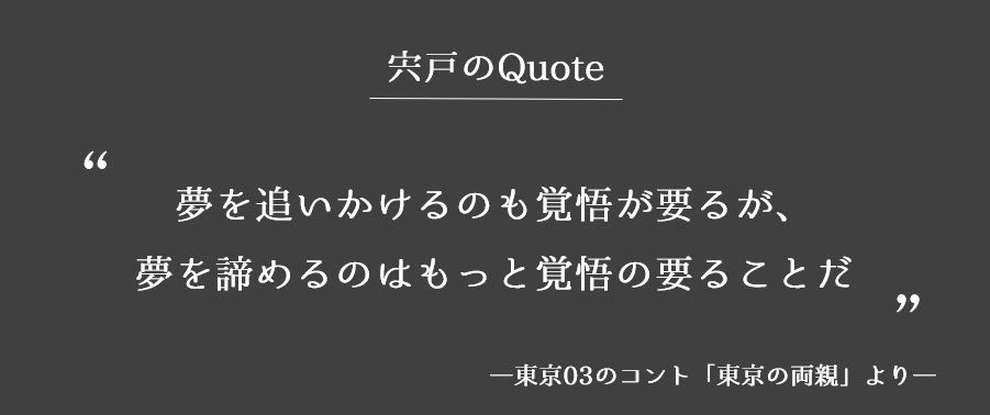 そんなとき、笑いたくてYouTubeで見た東京03のコント動画。ミュージシャンの夢を諦めて就職したことを報告しに来た若者に、行きつけの定食屋の店主が放った言葉。