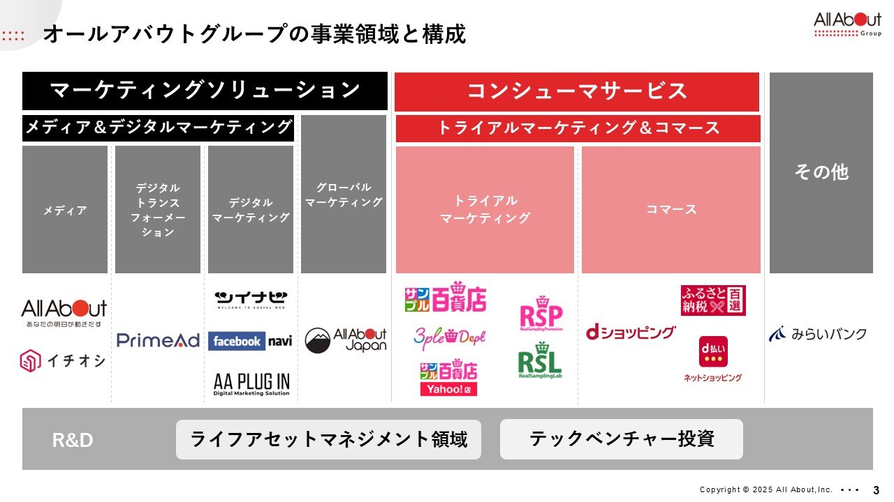 また下段には「R&D(Research & Development)」とありますが、この2つの事業のセグメント柱に加え、将来的に3つ目の柱とするべく「ライフアセットマネジメント領域」を掲げております。 こちらは、生活者の人生基盤をライフアセットと名付けまして、主にお金、健康、キャリア、そしてホームといった人生の基盤領域を強化する事業として、今、いろいろな形で投資を進めており、R&Dと位置づけています。