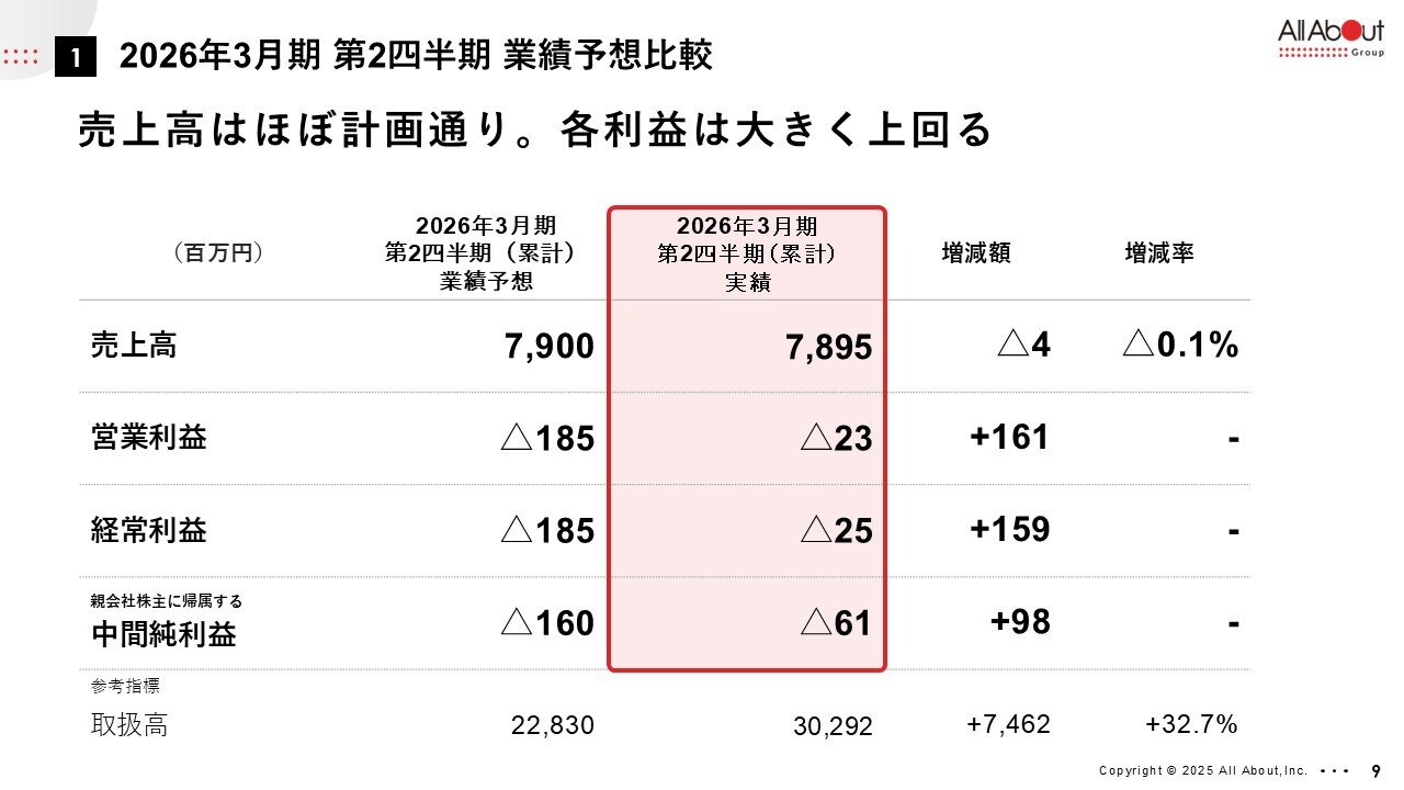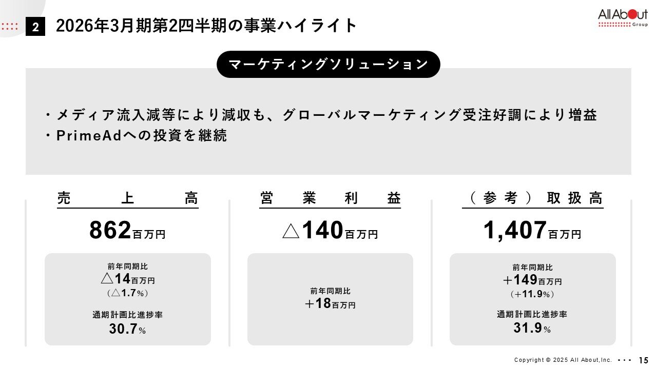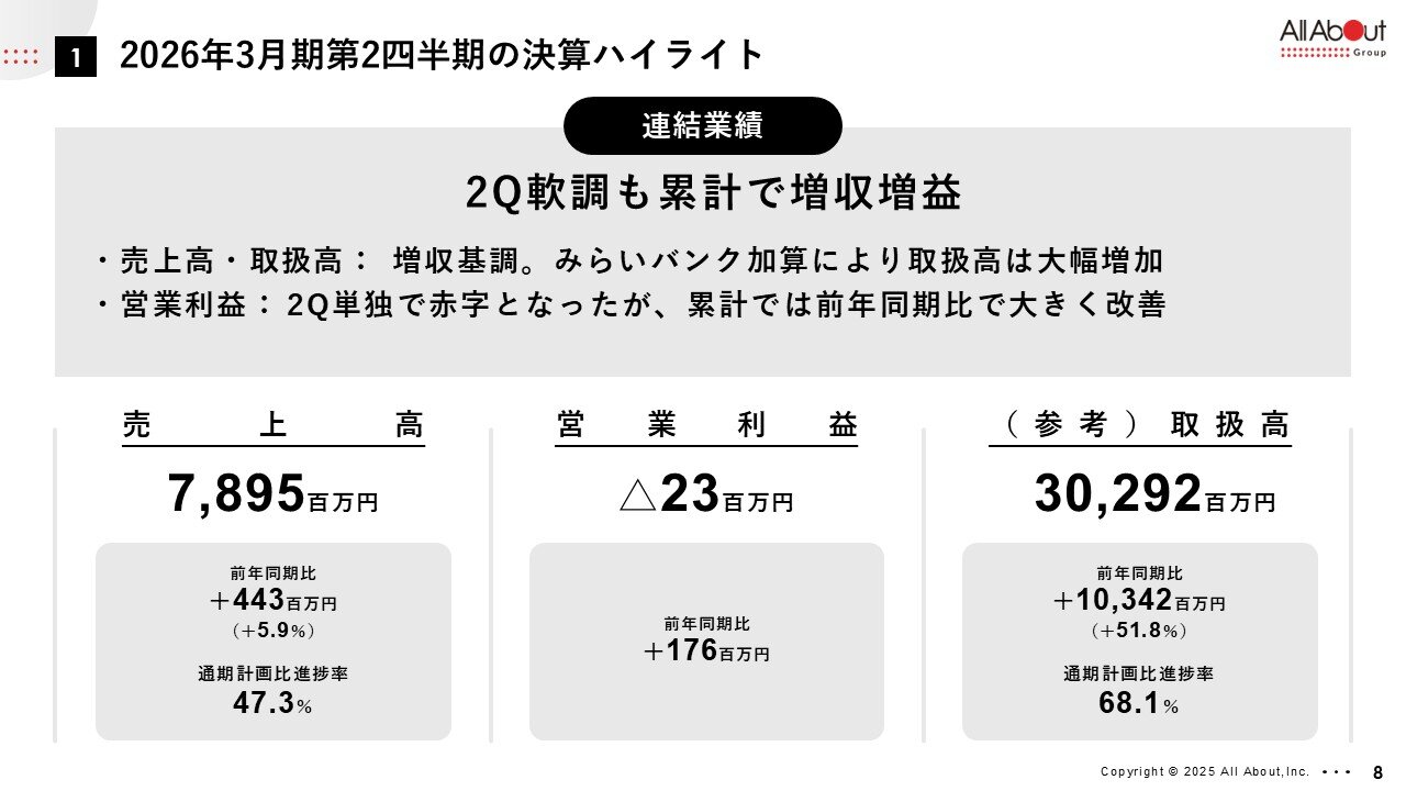 第2四半期は若干軟調ではございましたが、累計で増収増益ということでございまして、売上高、取扱高がともに増収基調ということになっております。また、みらいバンク社の加入により、取扱高は大幅に増加したというところが1つポイントになるかと思います。また営業利益面では、第2四半期単独では赤字でしたが、累計におきましては前年同期比で大きく改善しました。