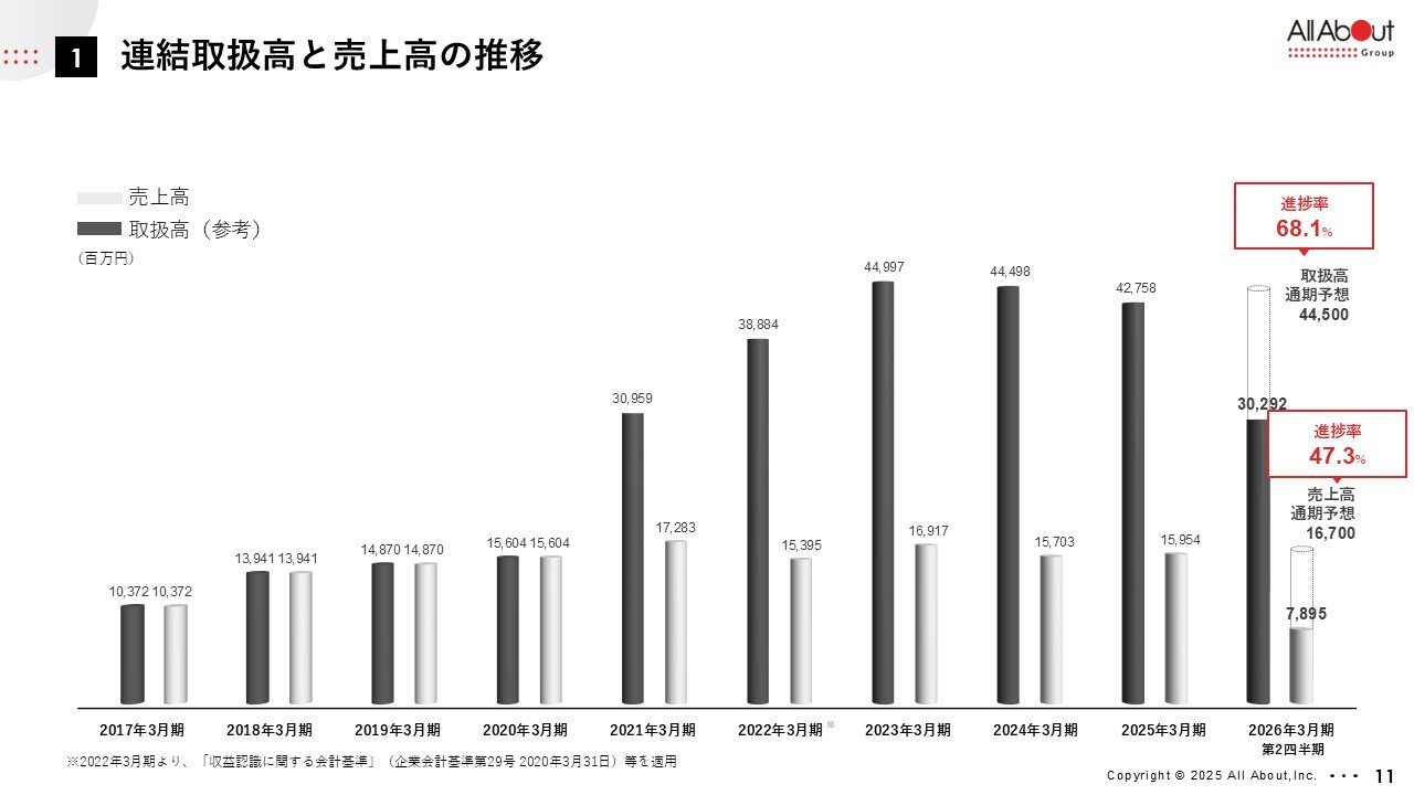 こちらが、以上の数字の経年変化です。このグラフは、連結の取扱高と売上高の推移です。 2022年3月期より、収益認識に関する会計基準を変更しておりますので、そこの部分はご留意いただければと思います。 今期につきましては、進捗率がそれぞれ68.1%、47.3%ということで、オールアバウトグループは下期の予算の方が大きな構造になっておりますので、進捗に関してはグリップできていると考えております。