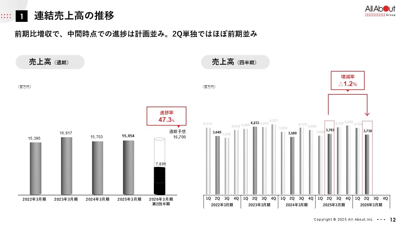 こちらは、連結の売上高の推移、左側が年度別、右側が四半期ごとです。 四半期推移では若干の減少となっています。こちらは、気候や季節要因など環境要因がございますが、第1、第2四半期累計で言うと、増加ということでグリップができていると考えております。
