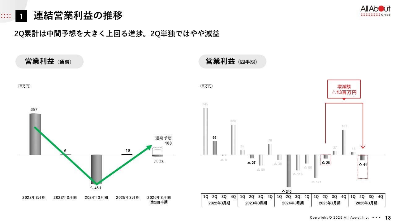 こちらが、連結の営業利益です。 左側が年度でございますが、昨年度、一昨年度に大きく投資をしたところから、プラスに持ってきて、今期はまたさらに上に持っていけるというところで、この第1四半期、第2四半期の累計としては、黒字確保という形で推移しているかなと考えております。 四半期の比較で言うと、第2四半期につきましては、やや軟調ということでございますが、概ね計画通りかなと思います。