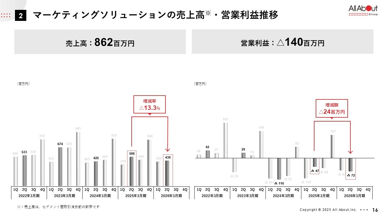 マーケティングソリューションセグメントにおきましては、祖業である「All About」を中心としたデジタルメディアにおいて利用者の流入が減少し、減収となっており、このあたりは大きな事業環境変化が要因で予測できている部分もございます。