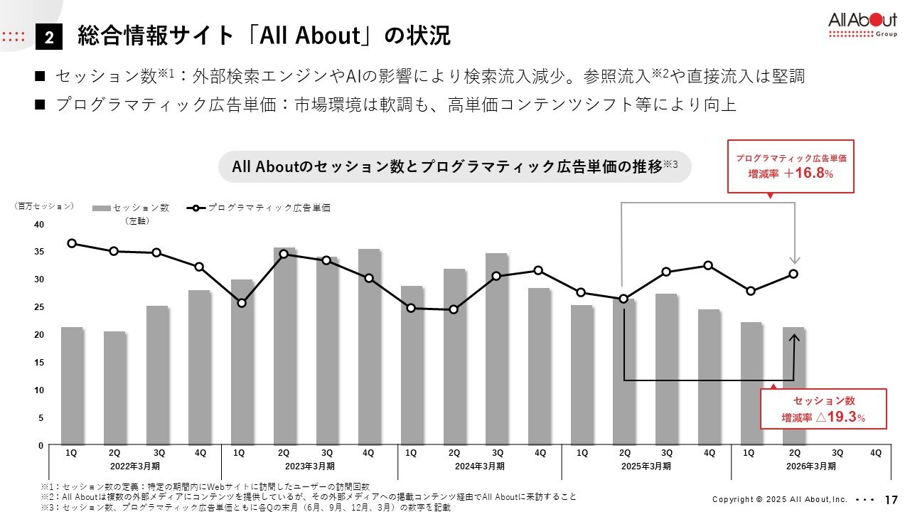 一方で、検索エンジンに頼らない我々のコンテンツを多くのユーザーを持っていらっしゃるいろいろなサービスにコンテンツ提供し、そこでユーザーの接点を作っていく。そこから「All About」の方に来ていただくような参照流入、さらに直接流入は伸びておりますが検索流入の大きな流入減少を賄いきれていないということで全体としては減少しています。こういった環境変化は今後も継続するのではないかと思っておりますので、このあたり、しっかり打てる策を講じていきたいと考えています。