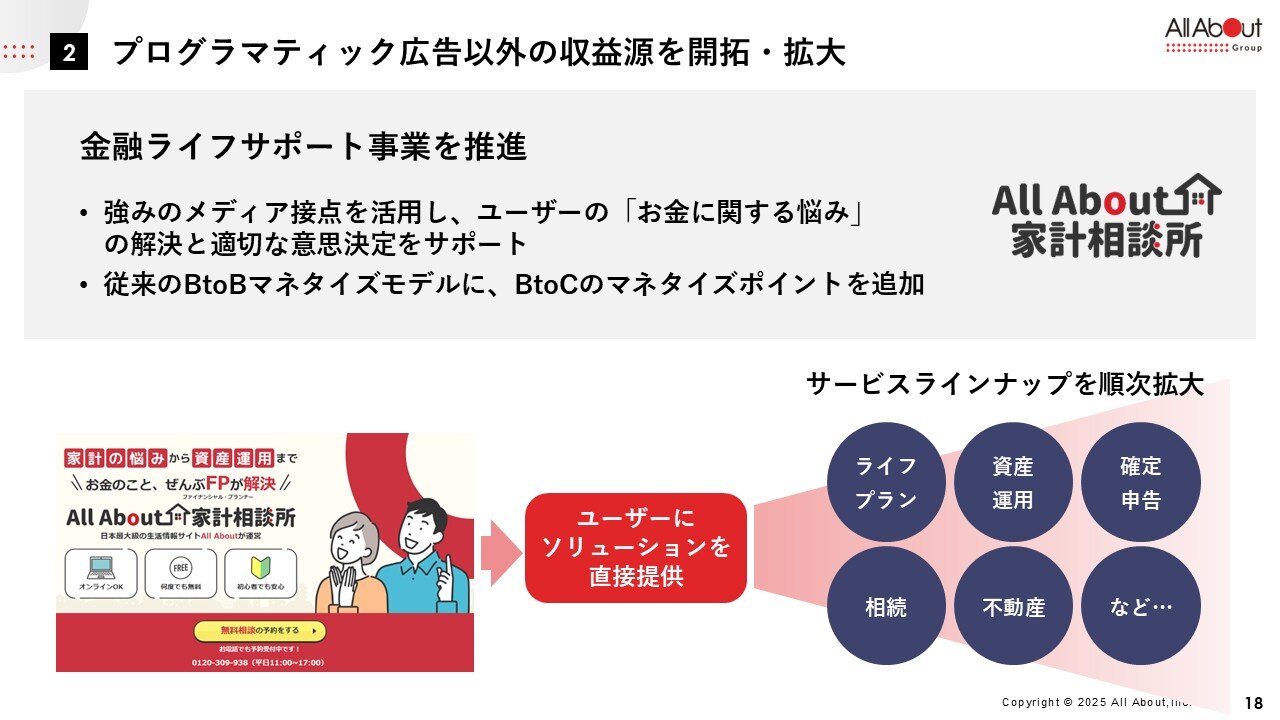 これは、広告主への送客ではなく、我々のサービス内で具体的なサービスを展開していく形です。 第1弾として、「All About 家計相談所」というサービスに注力しています。特に生命保険選びの分野においては、ユーザー接点の強みを持っているため、お金に関する悩みの1つである「生命保険の選び方」などを、しっかりサポートさせていただきます。これまでは広告主に送客していたところを、我々自身が生命保険を取り扱うポジションになる取り組みを開始しており、広告ビジネスから、サービスによるマネタイズを新たに追加しています。
