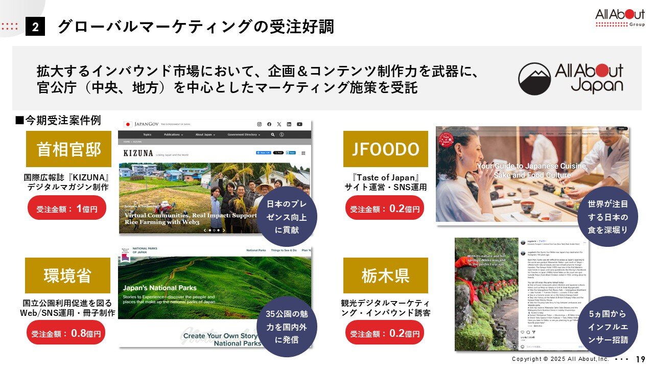これらは一例ですが、非常に多くのニーズがあり、この分野で長い経験を持つ我々のチームの収益は伸びています。 今後もインバウンド、日本食の海外普及、地方創生、環境面といった大きな軸で、日本の良さを海外に発信していく取り組みを強化してまいります。 そのための強力な武器となるのが「All About Japan」です。これは、日本のことが大好きで、日本をよく知っており、かつデジタル上で影響力のある外国人の皆様を組織化した「Tomodachi(トモダチ)」というコミュニティを有し、6ヶ国言語で世界に向け情報を展開するコンテンツサイトです。 このコミュニティとサイトをベースにさまざまなプロジェクトを運営できることを強みとし、さらに事業を伸ばしてまいります。