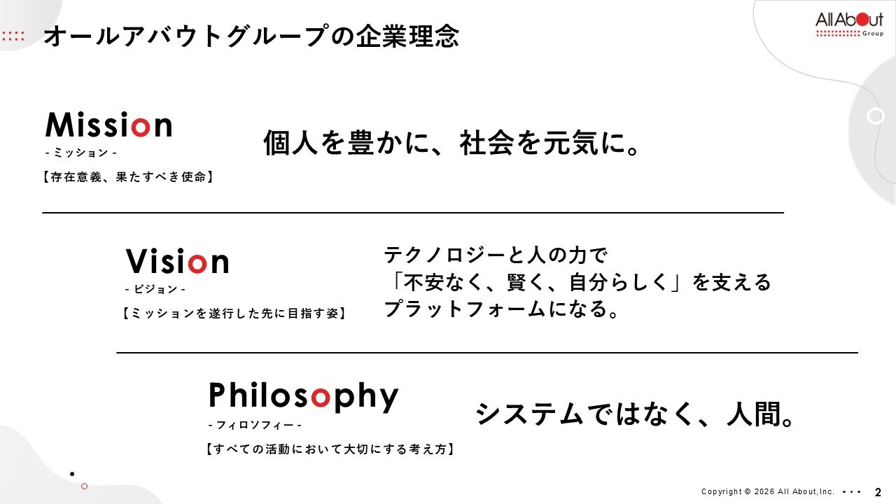 はじめに、オールアバウトグループの企業理念、ミッション・ビジョン・フィロソフィーでございますが、こちらは不変でございます。毎回ご紹介しておりますので、個別のご紹介は割愛いたします。
