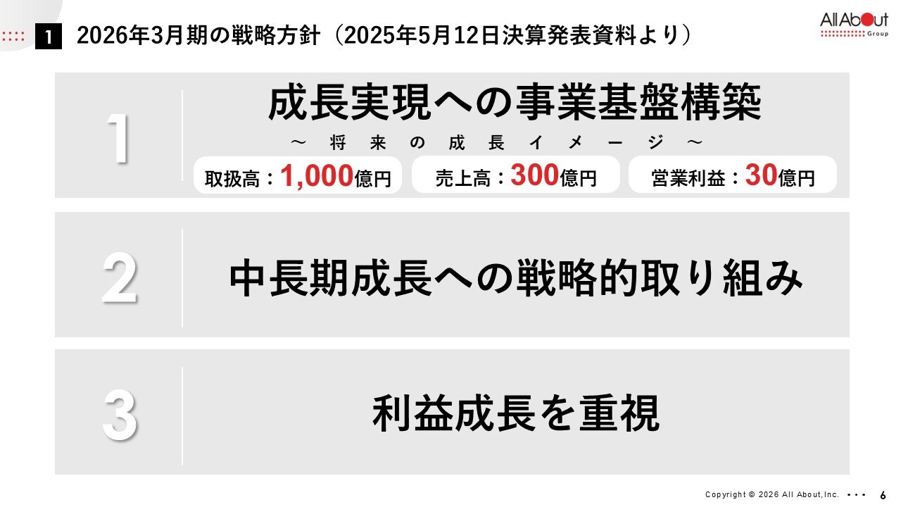 この方針は当該期も変わりません。具体的なポイントは3つあります。まず1点目は、将来的にグループ全体で「取扱高1,000億円、売上高300億円、営業利益30億円」という規模まで成長させるために、その基盤作りに注力することです。2点目は、その基盤作りのための具体的な戦略を推進していくこと。そして3点目は、投資は継続しつつも、徐々に利益を上げていくことを重視してまいります。この3点を軸に据えて、今期をスタートさせています。
