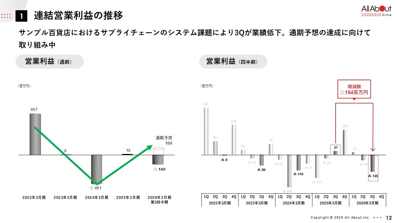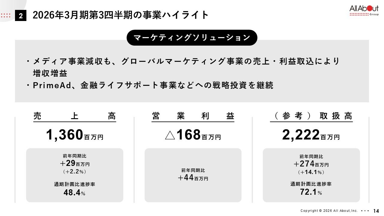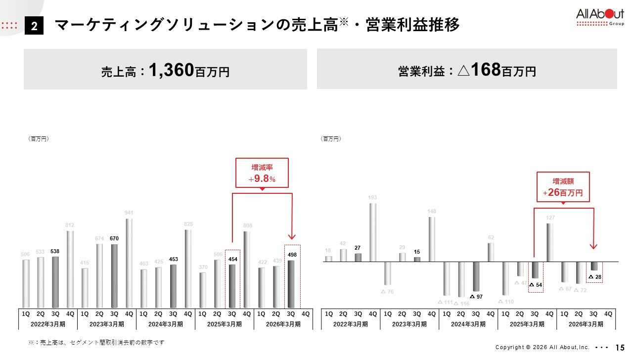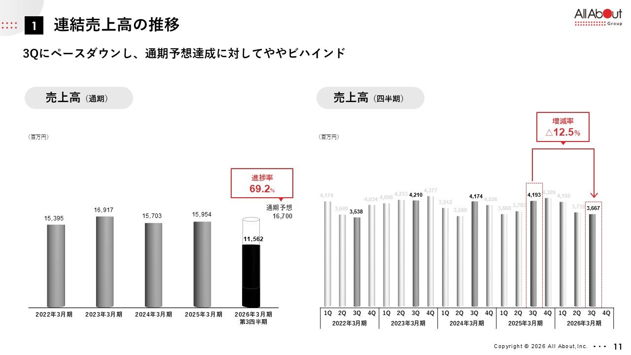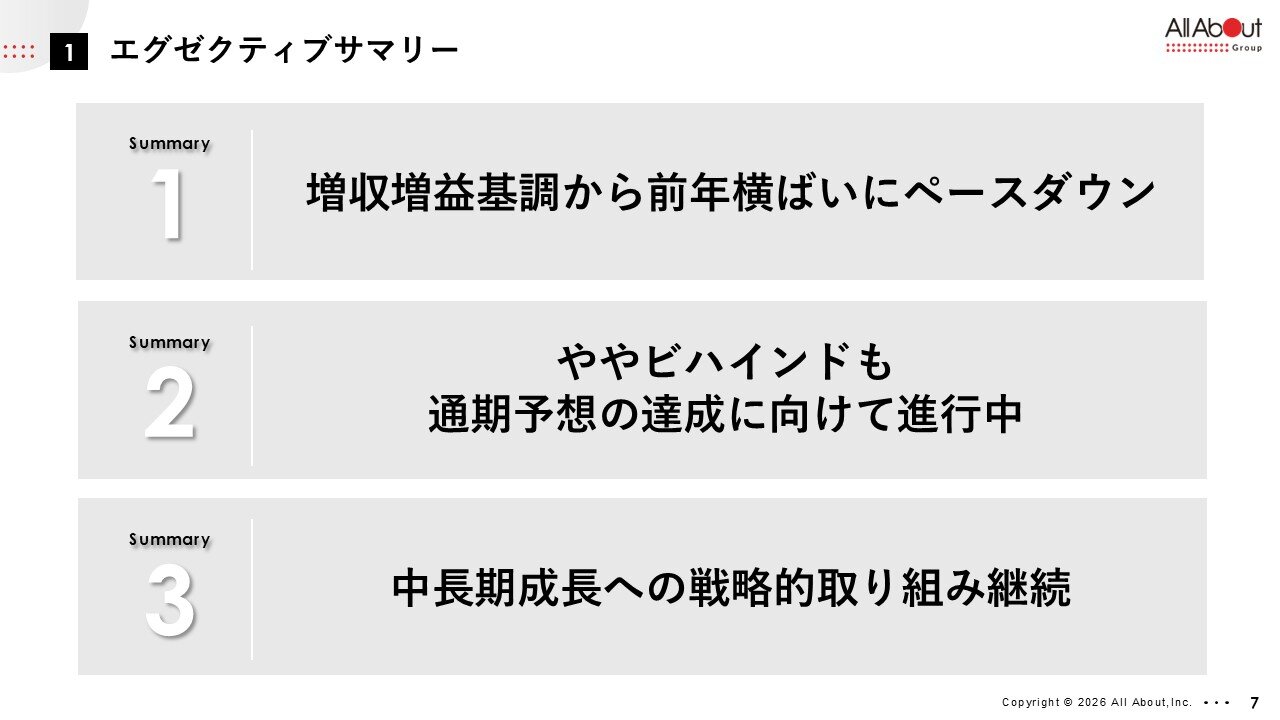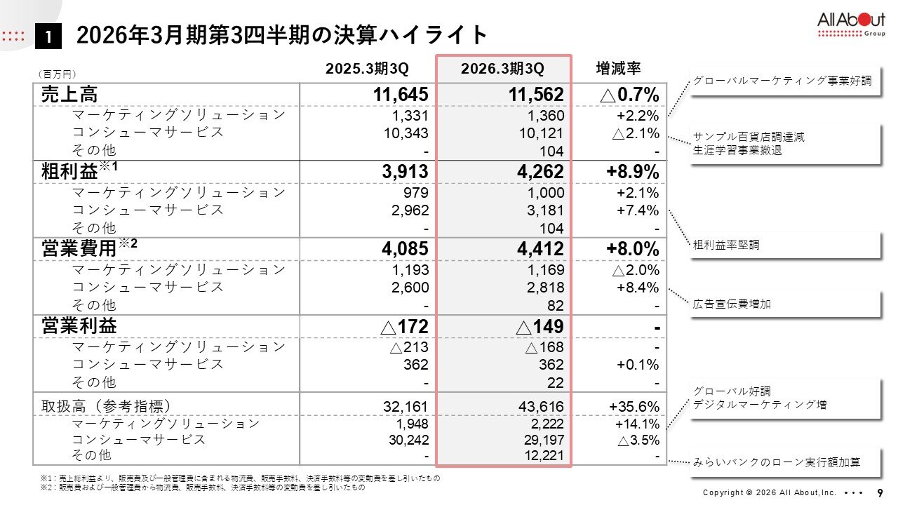 2026年2月12日に発表いたしました、株式会社オールアバウトの2026年3月期第3四半期決算補足説明の内容を書き起こしでお伝えします。