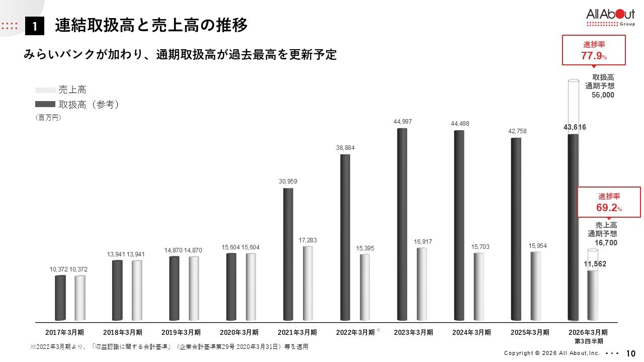 こちらは、取扱高および売上高の経年の推移をまとめたグラフです。補足しますと、今期は取扱高が大きく伸びていますが、これは期中に「みらいバンク」がグループ入りしたことが大きな理由になっています。