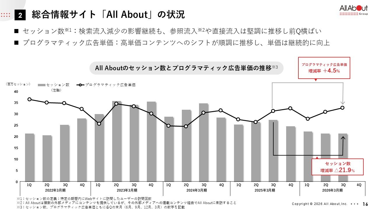 ご覧の通り、当該四半期におけるセッション数は前年比で2割ほど減少しています。これは大きな環境変化の中でも、特に検索エンジン等の「AI Overviews」という機能が実装された影響によるものです。もともと「All About」は、ユーザーが検索した際に、一次情報コンテンツとして上位表示される「SEO」において、歴史的に強みを持ってきました。しかし現在、検索エンジンの上位にAIによるサマリー(要約)が表示されるようになったことで、ユーザーがサイトに直接遷移する前に、検索結果画面で留まってしまうという傾向が見て取れます。業界全体で2割ほどの影響が出ている状況ですが、これはAIの浸透による環境変化そのものだと考えています。我々はこのAIの裏側に入る「信頼できる重要な情報源」としてのポジションを強化する戦略をとっておりますので、一定期間はこうした変化が起こるものと考えています。