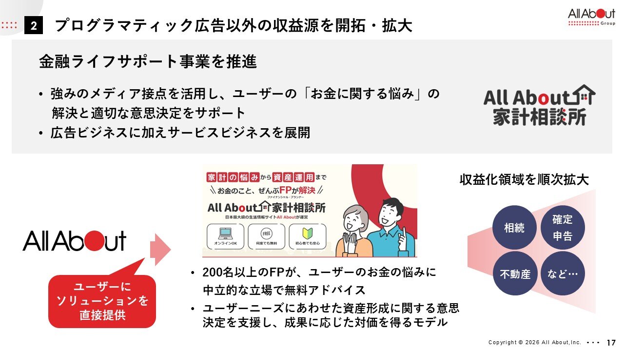 特にメディア「All About」においては、お金周りの分野でユーザー利用が非常に強いという特徴がありますので、まずはこの領域でサービスビジネスを展開しようと図っております。この第3四半期、特に11月から12月にかけてですが、「All About家計相談所」というサービスを通じて、AIにはなかなか難しい「人間ならではの専門家の知恵」を提供し始めています。具体的には200名以上のファイナンシャルプランナーの皆様が控えており、その強みを活かしてユーザーの資産形成に関する意思決定のお手伝いをする、というポジションを確立しつつあります。