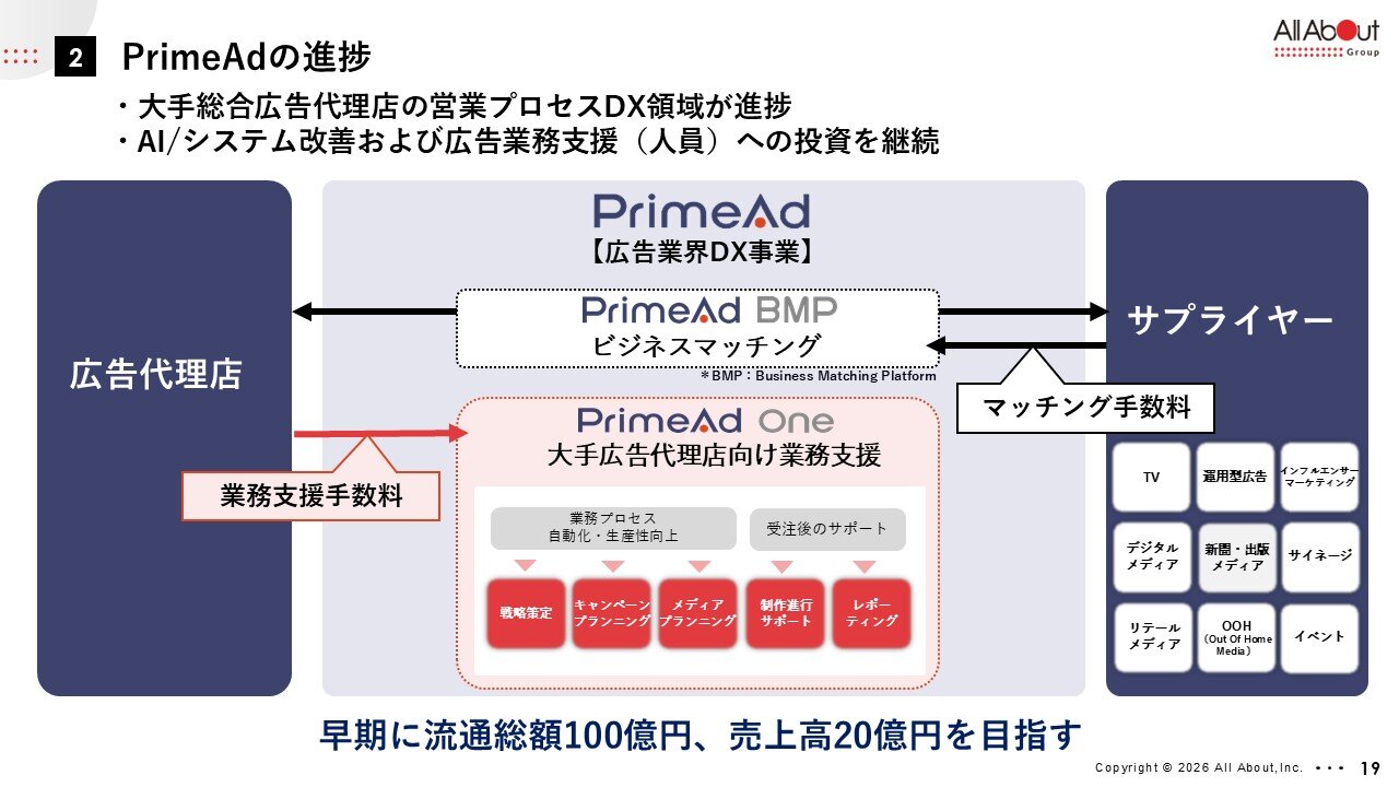 こうしたメディア、デジタルマーケティング、そしてグローバルPRを取り巻く事業環境ですが、AIの台頭などによって、現在デジタル広告業界は非常に大きな変化期にあります。この1年を見ても、多くのデジタル専門代理店が総合代理店に買収されるなど、業界再編の動きも加速してきました。そうした激動の中で、我々のビジネスポジションを大きく進化させるべく注力しているのが、この広告業界DX事業「PrimeAd」です。