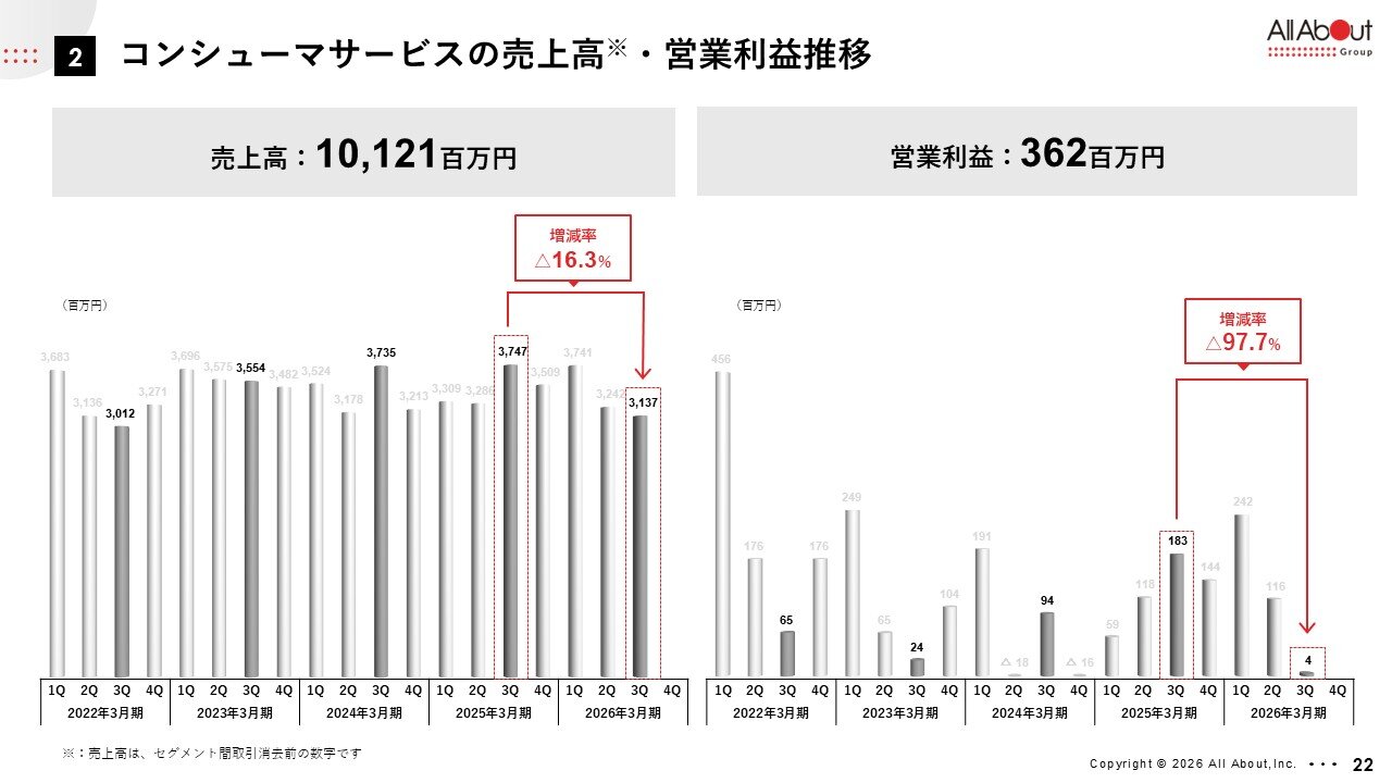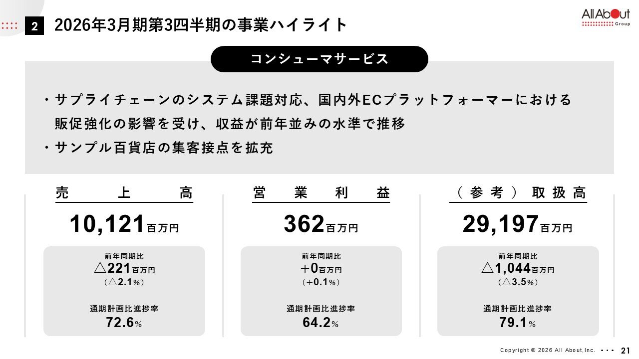 当セグメントを取り巻く環境について、冒頭にも申し上げました通り、現在はサプライチェーンにおいて業界全体のシステム課題が発生しております。また、国内外のECプラットフォーマーによる販促強化といった大きな環境変化の影響も受けております。こうした背景から、第3四半期の収益は前年並みの水準での推移となりました。
