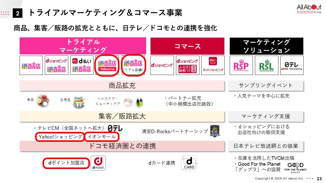当該セグメントにおきましては、大きく3つの事業を展開しております。1つ目は、「サンプル百貨店」による「トライアルマーケティング」、2つ目はNTTドコモ様と共同運営している「dショッピング」などのコマース事業、そして3つ目が、これら事業にて売り手側のメーカー様を支援する「マーケティングソリューション」です。
