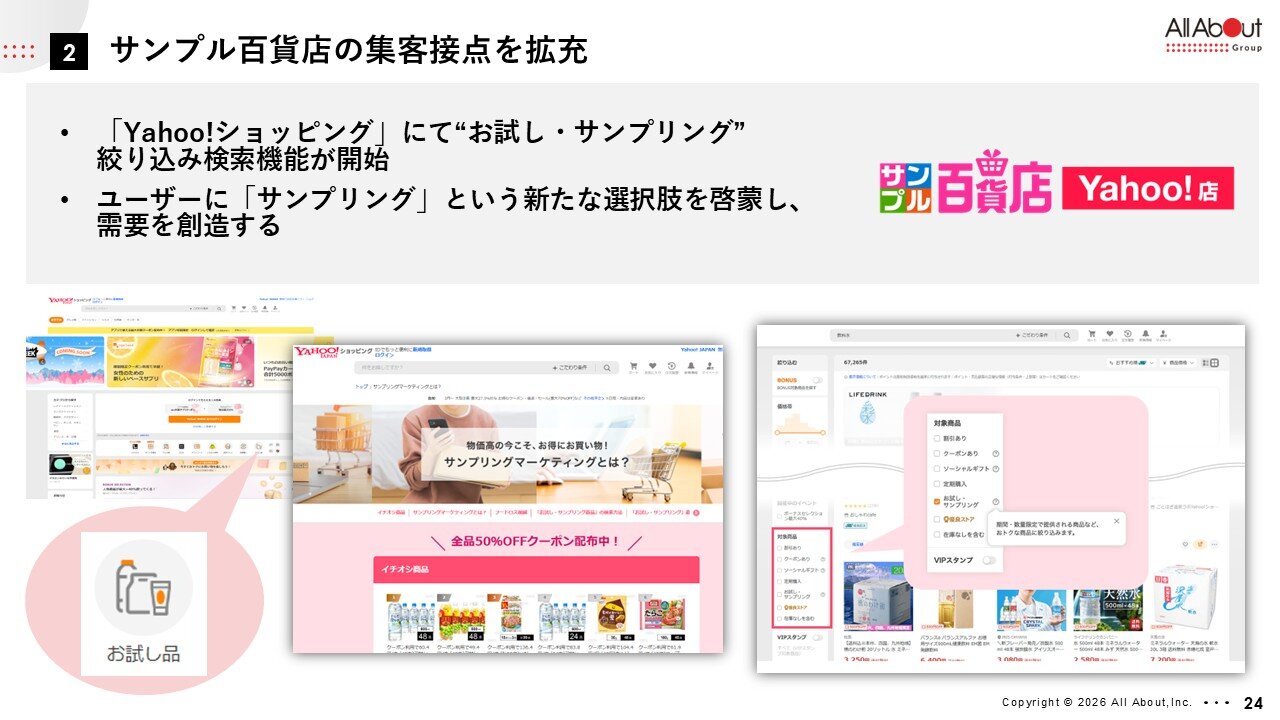 LINEヤフー様との取り組みについては、Yahoo!ショッピング内に「お試し・サンプリング」という新たな切り口をスタートしていただきました。この分野において我々はナンバーワンと自負しておりますので、LINEヤフー様の多くのユーザーの皆様に向けて、「お試し買い」の体験をしっかり提供していきます。