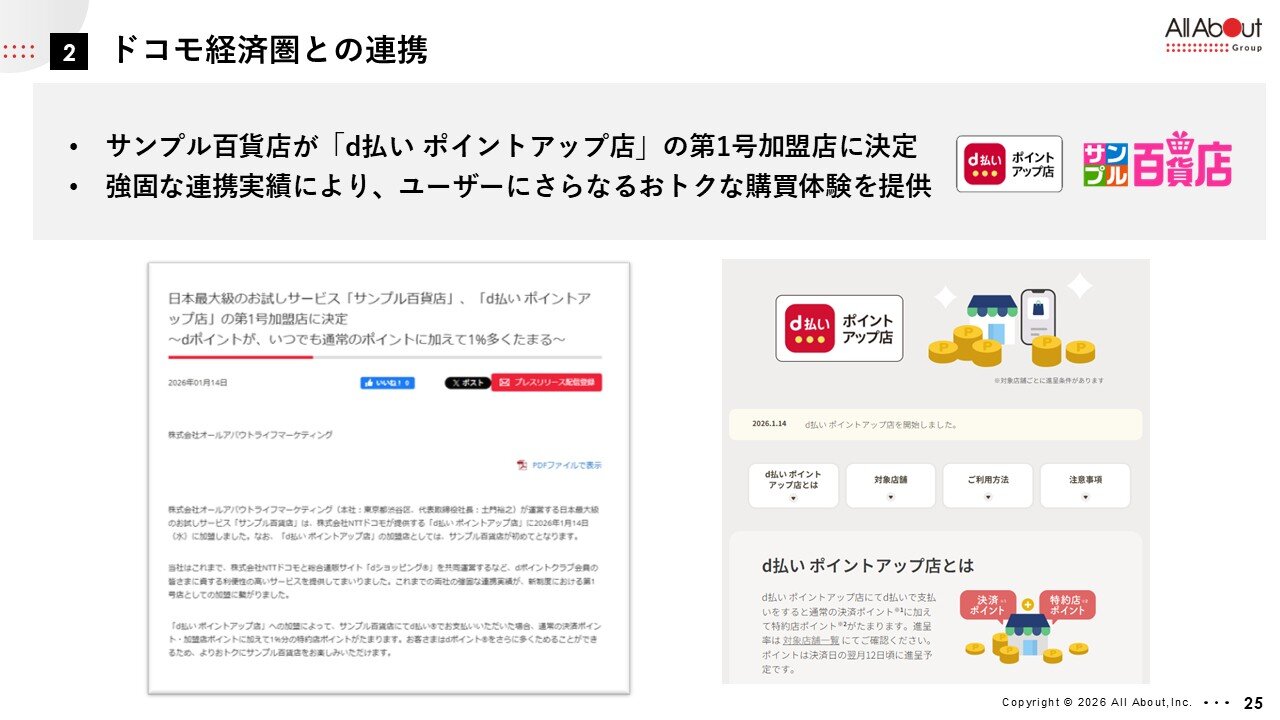 3点目は、NTTドコモ様との連携強化です。「サンプル百貨店」が「d払い ポイントアップ店」の第1号加盟店に決定するなど、dポイントやd払いを活用した施策を通じて、ユーザーの購買促進を推進しております。