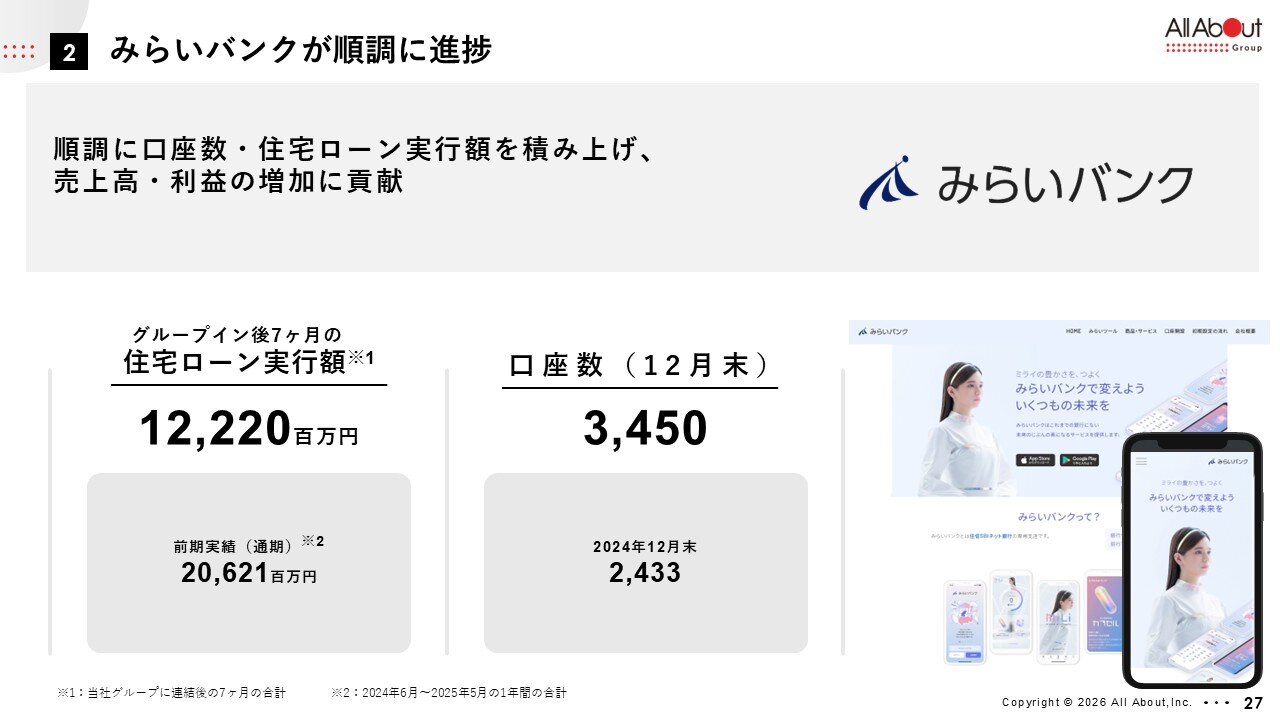もう一点、期中にグループインいたしました「みらいバンク」についてお話します。こちらは、住信SBIネット銀行様のBaaS(Banking as a Service)プラットフォームを活用して、銀行代理業を行っている会社です。