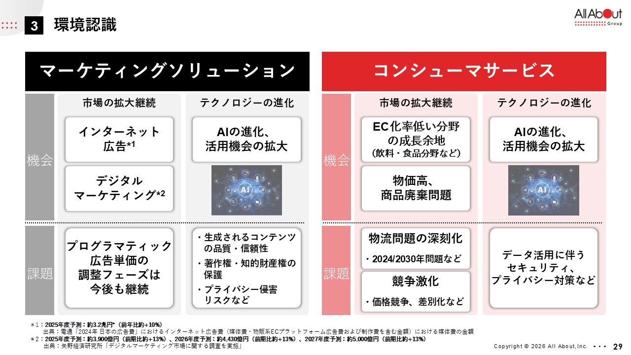 環境の変化、特にAIの台頭については、我々にとって大きなチャンスでもあると同時に、向き合うべき課題でもあると捉えていますが、ここをしっかりと見据えながら事業を進めてまいります。コンシューマサービスにおいても、AI活用はもちろんのこと、物流やセキュリティといったリアルの現場で起こる課題についても、しっかりと解決してまいる所存です。