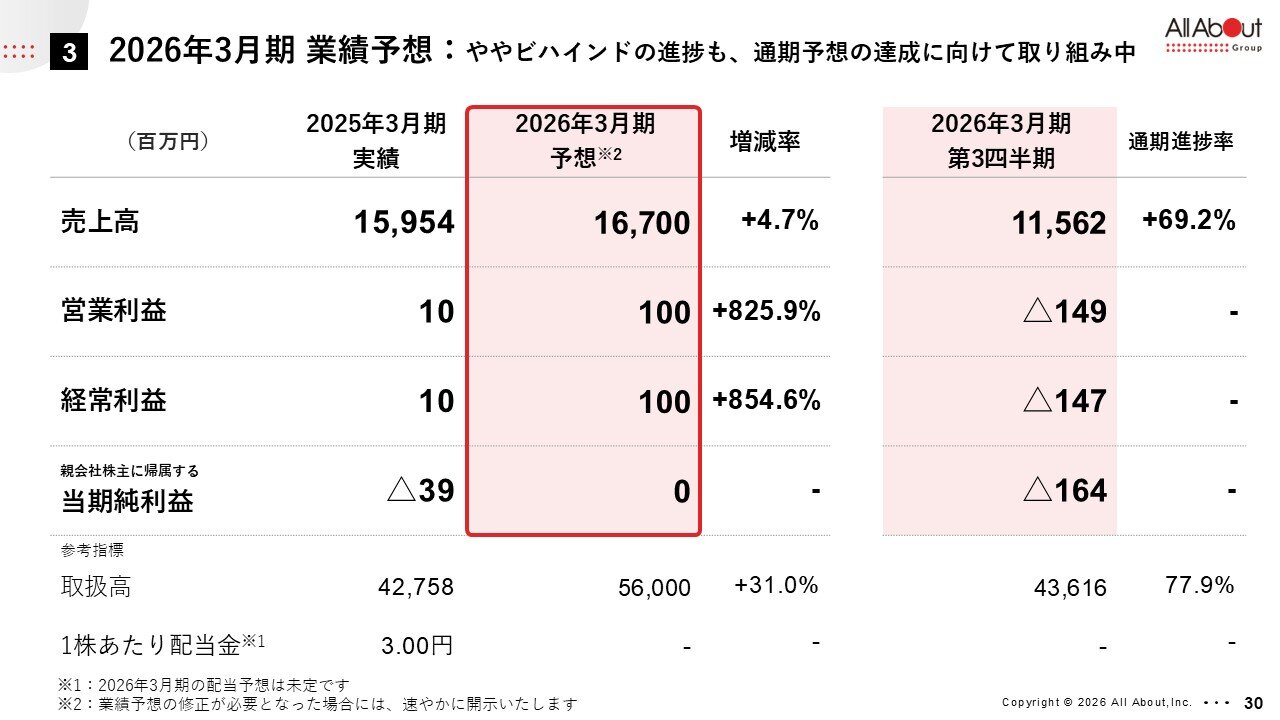 第3四半期が終わった現時点では、数字の面で少し課題も残っております。ただ、期末に向けて当初掲げた通期の予測数値は変えずに、達成に向かって進んでいることをご報告いたします。