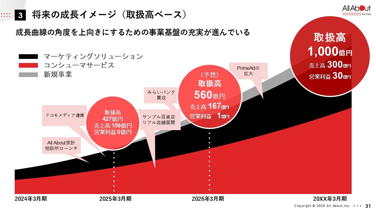 中長期的には、グループ全体で取扱高1,000億円、売上高300億円、営業利益30億円を目指し、その実現に向けて戦略の推進に邁進してまいります。