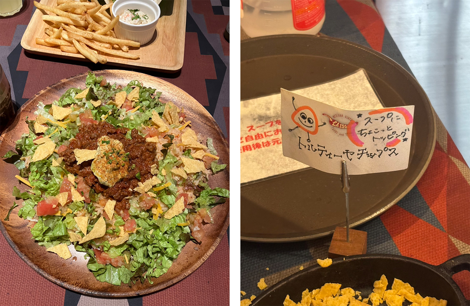 この日も「タコライス」を注文しました。お腹が空いていたのでラージサイズにしたのですが、ごはんが見えないほど具材がたっぷりのっていて、食べ応え抜群! 野菜やアボカドもたっぷりで、ヘルシーなのに十分な満足感が得られます。タコミートはジューシーで、スパイスが効いていながらも辛さは控えめで、とても食べやすいです。ランチタイムは、おかわり自由のスープ付き。トルティーヤチップスを入れていただくスープは、スパイシーでおいしいです。
