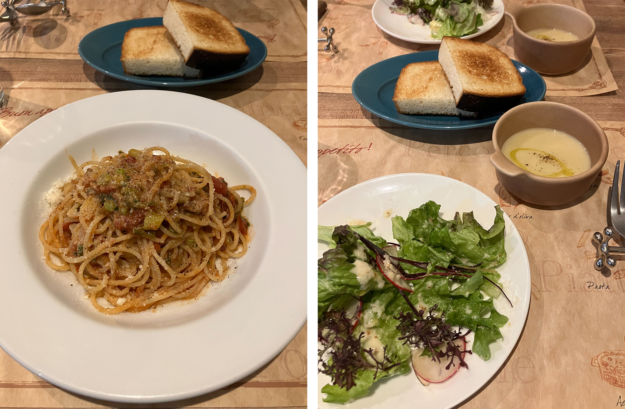 「自家製サルシッチャのトマトソースのパスタコース」にしました。 鎌倉野菜サラダは新鮮で、ドレッシングはシンプルでさっぱりしているため、野菜本来の甘味を楽しめます。季節の野菜を使った濃厚なスープ、メインのパスタも、素材の持ち味を生かした絶妙な塩梅で、最後の一口まで飽きさせません。一皿一皿に込められた工夫に、お腹も心も満たされました。