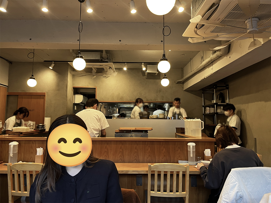 店内は白い壁と木目調の什器、食器類も白で統一されており、とてもシンプルで、清潔感のある印象です。お店の真ん中には三方を囲むカウンターがあります。比較的女性のお客さんが多い印象で、一人でも入りやすいと思います。また、オーダーや料理の提供もスムーズでストレスがなく、目が行き届いているなと感じます。